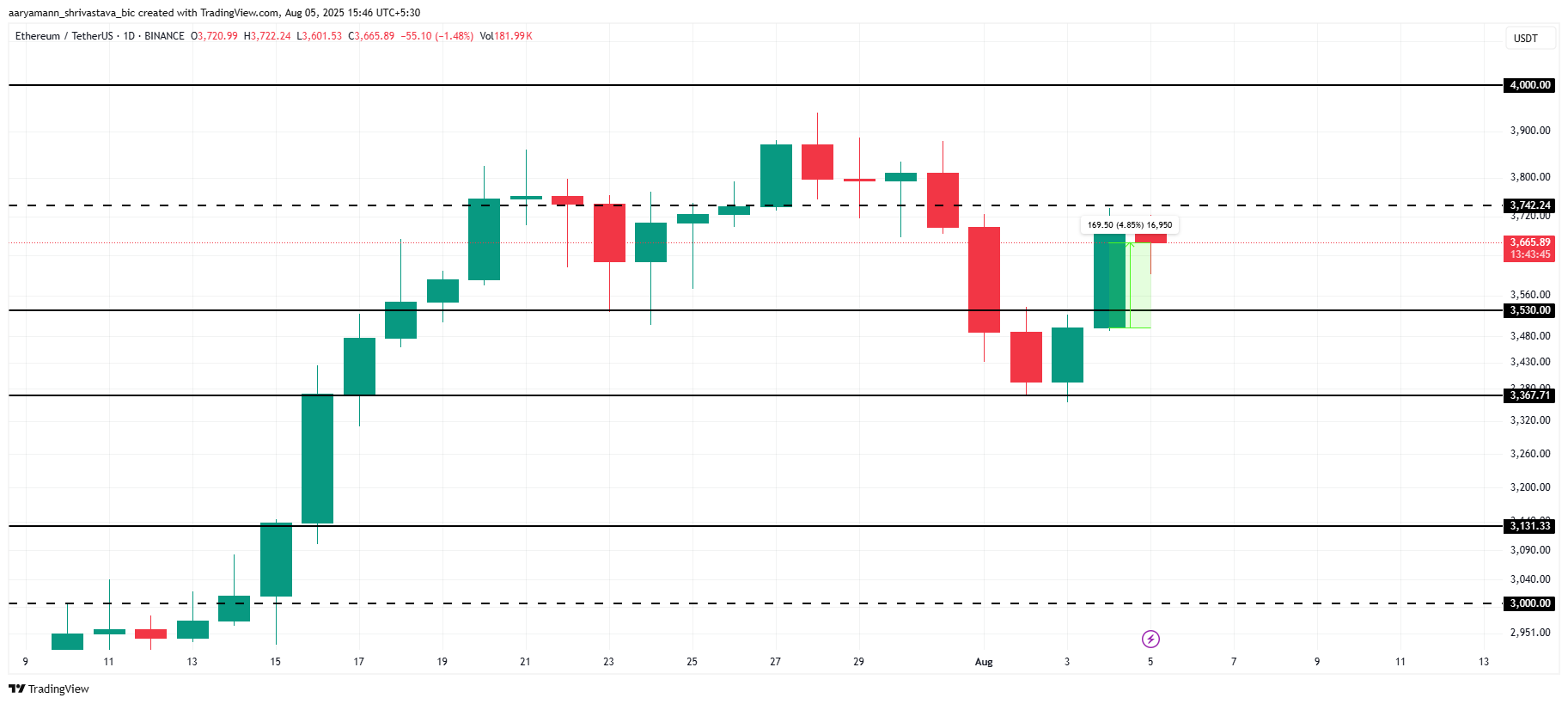 若持续遭遇抛压或ETF外流加剧,可能跌破3,530美元支撑并下探3,367美元,这将破坏当前看涨前景并预示更大规模回调。