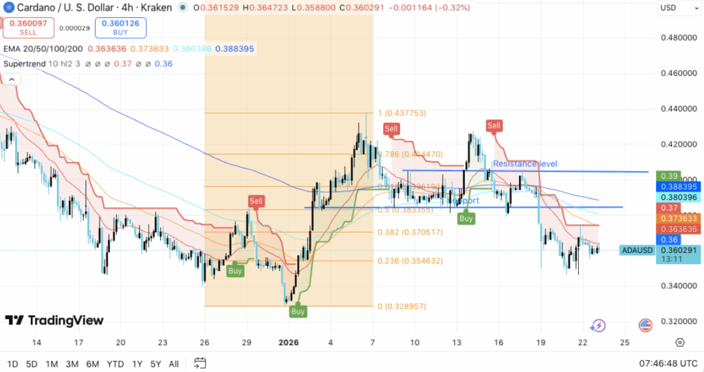 卡尔达诺(ADA)已进入谨慎盘整阶段,加密货币持续面临卖方压力,短期趋势仍牢牢受空头控制。ADA现交易于0.36美元附近,近期从区间高点遭遇强烈抛压,关键移动均线之下的走势引发了对进一步下行风险的担忧。