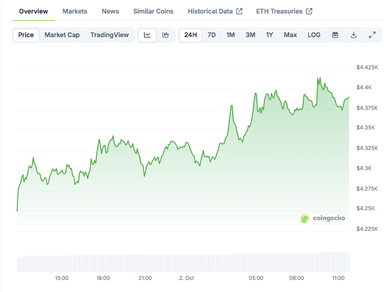 交易者持续关注以太坊对美元和比特币的近期表现。根据CoinGecko数据,ETH现价4388.63美元,24小时上涨4.77%,随着流动性回归实现周涨幅9.45%。