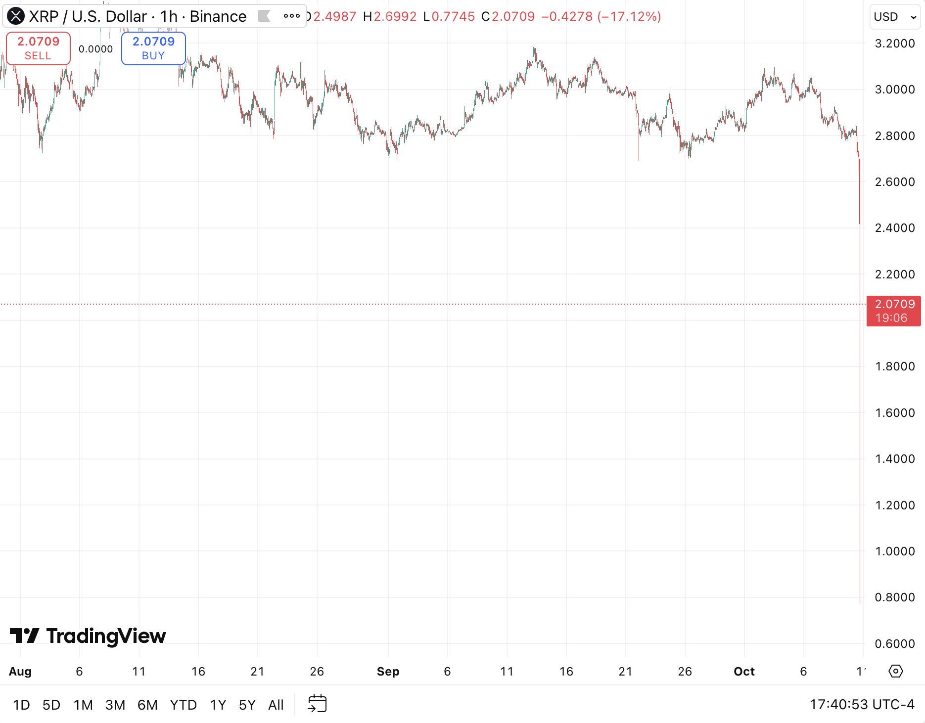 据CoinMarketCap数据显示,XRP市值缩水28.2%至1203亿美元,而24小时交易量激增近92%至108.2亿美元,表明市场波动加剧且存在大规模仓位调整。该代币从本周早些时候的3.00美元区间跌落,几乎抹去了9月份的全部涨幅。