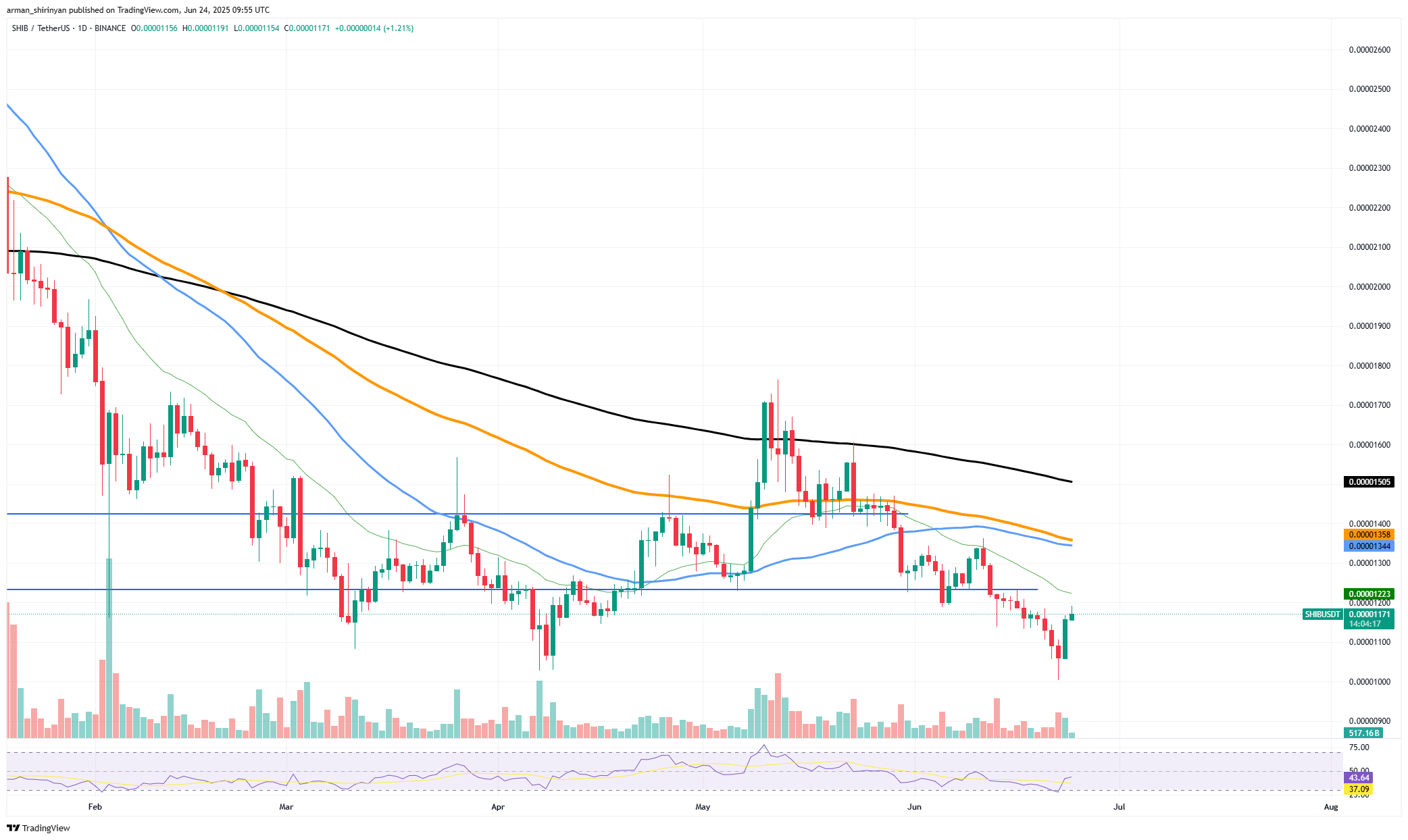 从技术角度看,SHIB的复苏显而易见——6月23日形成一根坚实阳线,日内涨幅达1.38%,价格推升至约0.00001173美元USDT。反弹恰好发生在近期测试过的局部低点上方,为多头提供了重新确立最低限度控制权的空间(尽管尚未形成优势)。