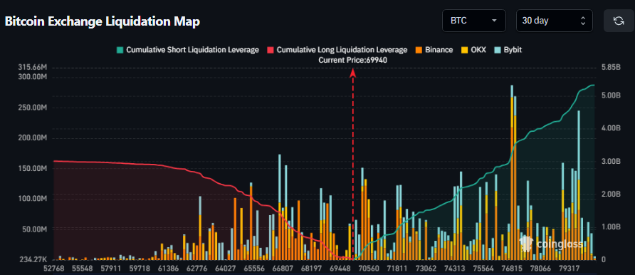 在当前价格接近70,000美元时,数据显示市场上方堆积着密集且持续增长的空头清算杠杆。这种态势表明看跌头寸正日益集中于更高价格区间,形成了价格上涨可能迅速迫使空头离场的潜在局面。