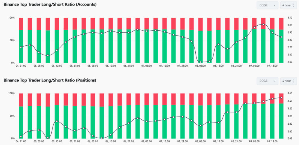 币安数据显示顶级交易员正在增加DOGE多头头寸,当前多头持仓比例达77.7%。基于持仓规模的多空比过去两日从2.80升至3.50以上。