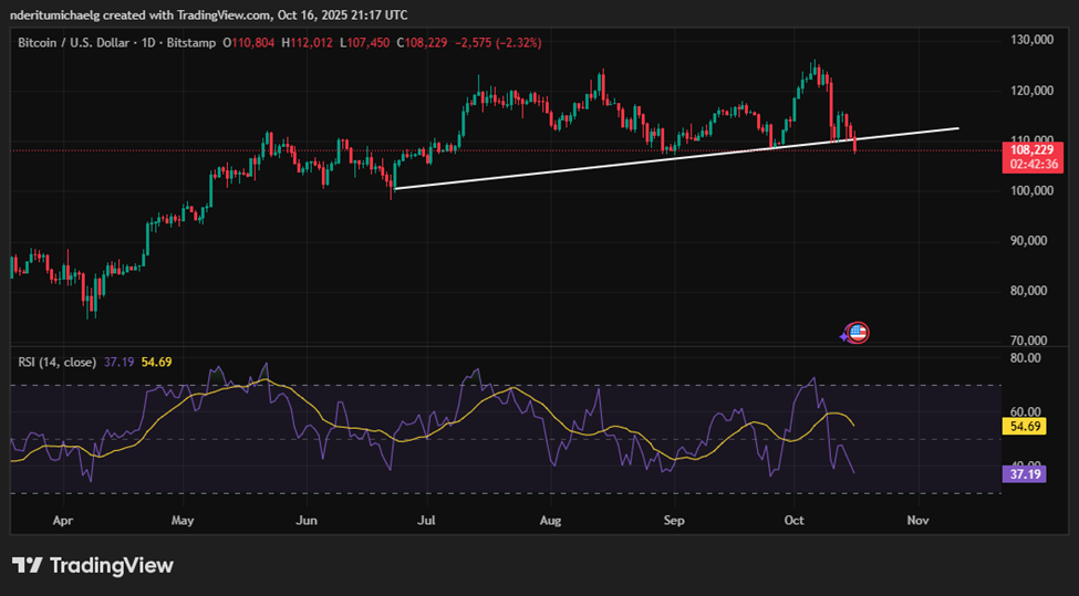 比特币价格在11万美元关口未能确立看涨势头后,最终向空头投降。BTC/USD汇率跌破10.8万美元支撑位,截至撰稿时报106,901.59美元。此前比特币价格曾短暂遵循短期上升趋势线,该支撑线与11万美元关口重合。但抛售压力激增叠加需求疲软,最终导致看空结果。
