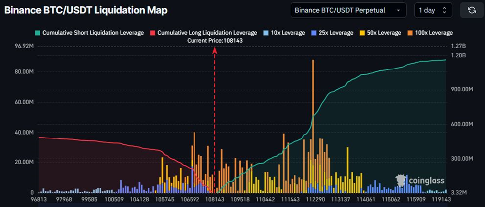 交易所清算热力图显示,若价格跌至10万美元,将威胁15亿美元的累计多头仓位;而在11.2万美元附近,则存在22亿美元的累计空头仓位清算风险。