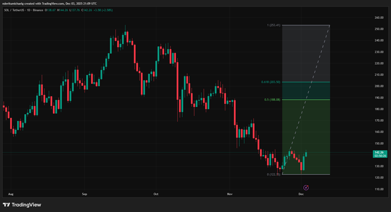 若当前价格区间最终成为底部区间,SOL可能迎来反弹延续。斐波那契回撤水平显示,从发稿时价位计算,其可能实现32%至42%的涨幅。