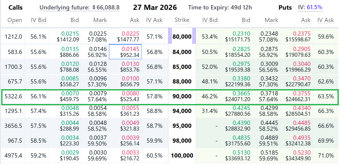 在Deribit交易所,于3月27日以90,000美元购买比特币的权利(看涨期权)周四报价为522美元。此定价表明投资者认为出现大幅反弹的可能性很低。根据Black-Scholes模型,这些期权反映出比特币在三月下旬达到90,000美元的几率低于6%。作为对比,同一日期以50,000美元卖出比特币的权利(看跌期权)交易价格为1,380美元,暗示着出现更深跌幅的概率为20%。