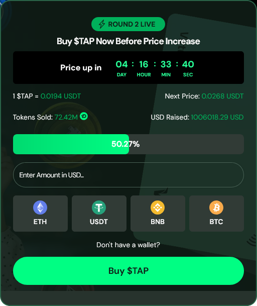 $TAP预售第三阶段价格为0.0194美元,进入第四阶段后将实现38.14%的涨幅。目前项目已售出超7200万枚代币,首阶段买家已获得55.2%的收益。预售火爆反映出市场对其成长潜力的高度认可。