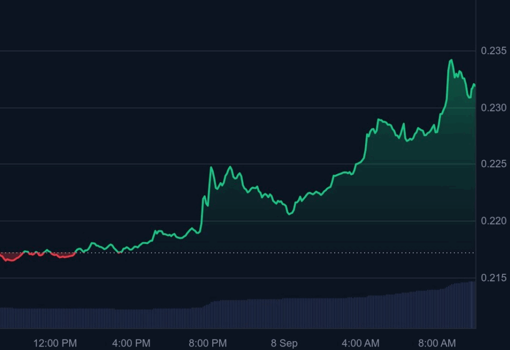 在各类动物主题代币中,以柴犬为标志的狗狗币(DOGE)过去24小时涨幅达6.89%。早盘时段该代币开盘报0.2164美元,随着多头力量占据主导,价格在测试0.2169-0.2338美元阻力区间后,最高触及0.2343美元。