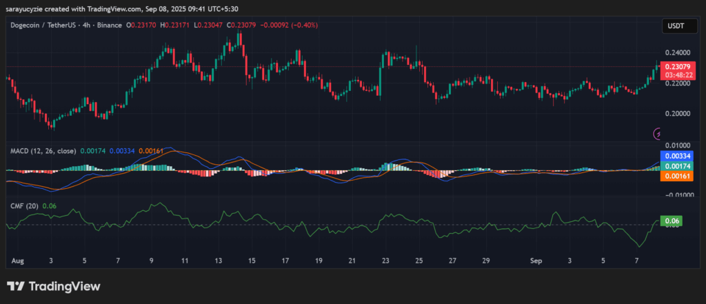 四小时线图显示该代币正构筑看涨形态。若当前趋势延续,多头可能推动价格测试0.2319美元阻力位。若动能持续强化,或将形成黄金交叉,助推DOGE突破0.2325美元关口。