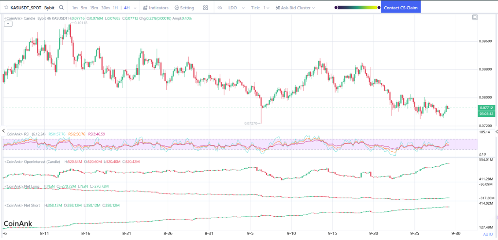 目前Kaspa已显现初步企稳迹象:0.072美元底部的稳固防守配合RSI回升及未平仓合约稳定,为日内延续温和反弹保留了可能性。