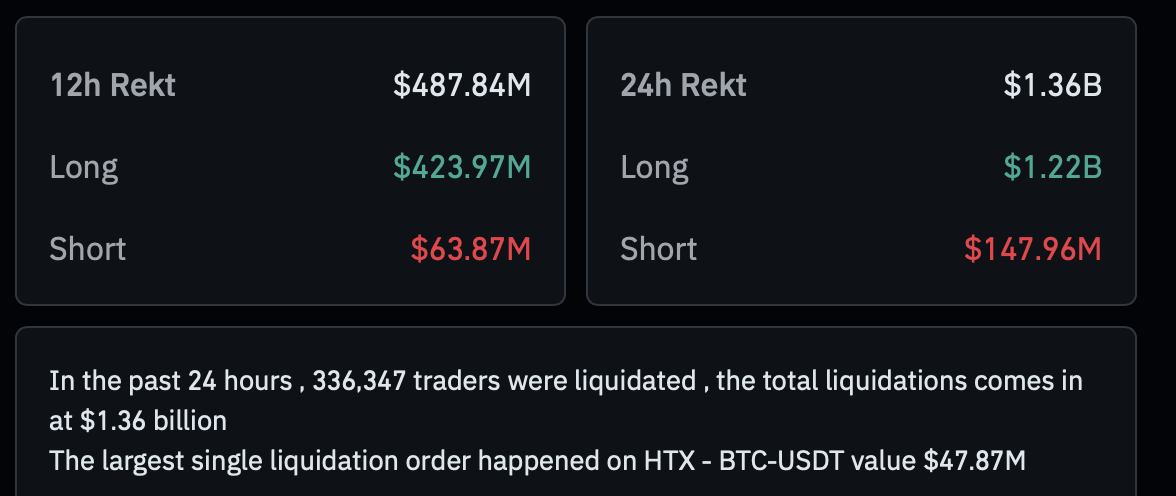 杠杆清算的多米诺效应加速了市场崩盘,24小时内波及超33.6万名交易者。最大单笔清算发生在HTX交易所(BTC-USDT交易对),价值达4787万美元。以太坊多头仓位在此次清算中首当其冲,当价格持续下探触发自动平仓机制时,又形成新的下跌动能。
