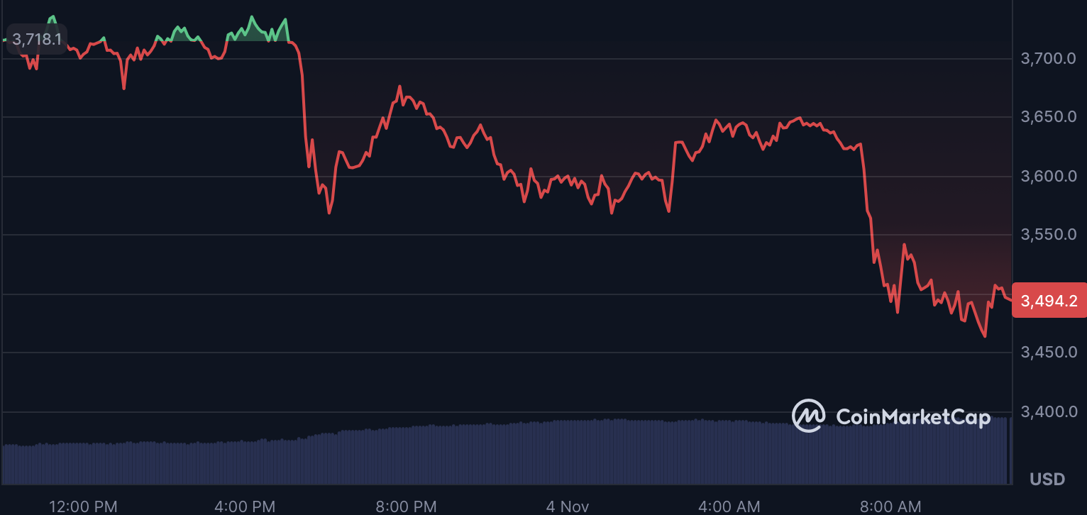以太坊跌破3500美元关口 去中心化金融动荡引发13.6亿美元清算潮