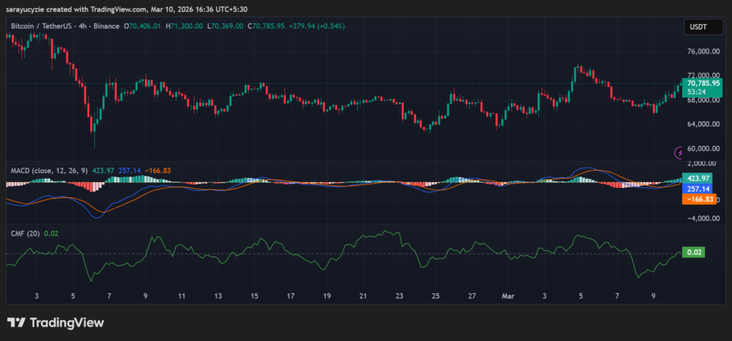 聚焦比特币4小时图,如果上升趋势增强,价格可能攀升至7.09万美元的阻力位。随着金叉的形成,多头可能会将价格推高至7.1万美元以上。相反,如果空头主导BTC市场,7.07万美元的支撑位将被击穿。假设下跌趋势加强,则可能形成死叉。价格可能逐渐跌破7.06万美元。
