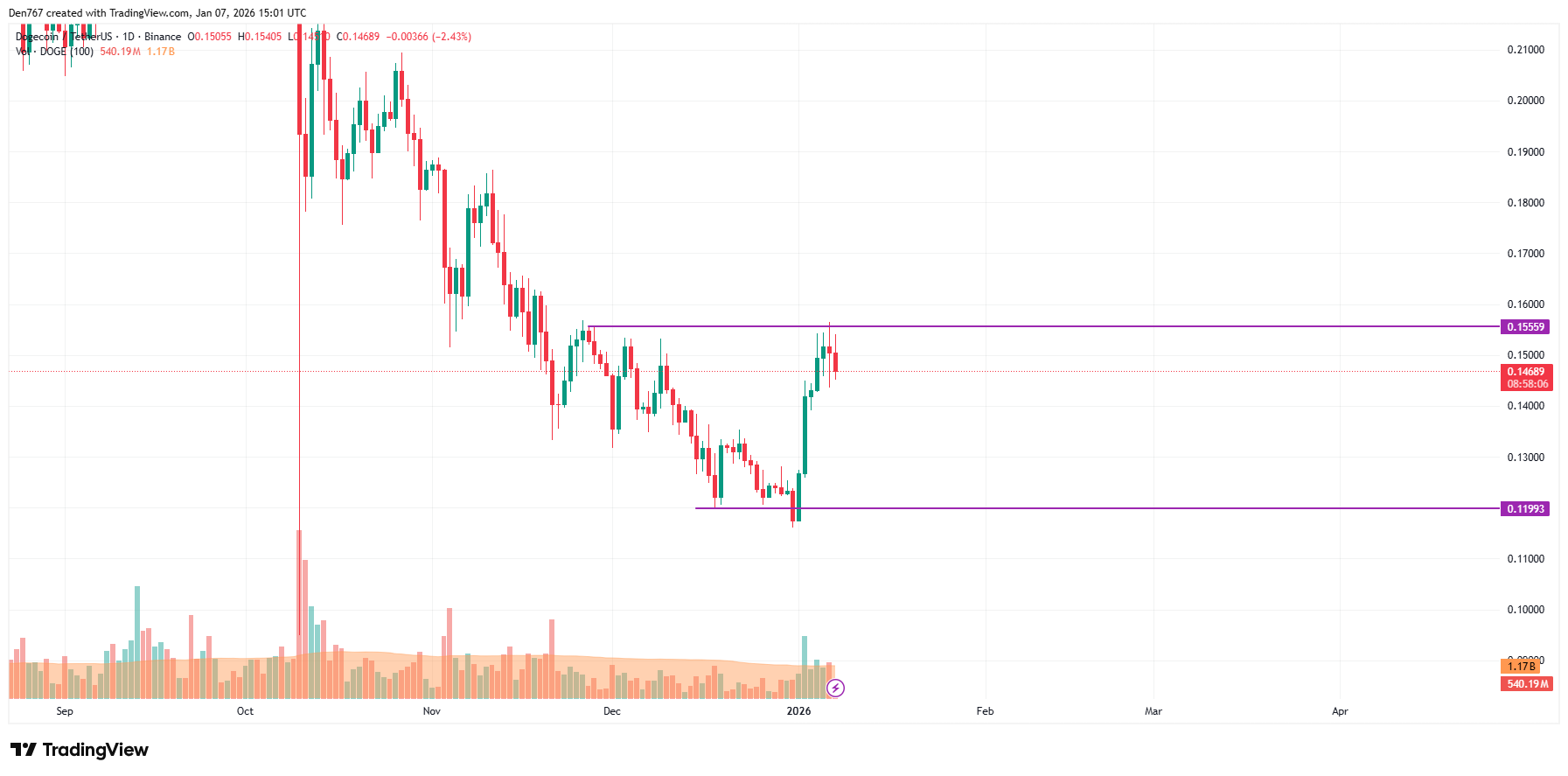 在更长的时间框架内,需关注价格在最近阻力位0.1555美元附近的收盘情况。若收盘价远离该水平,空头可能重新主导市场,从而导致价格回调至0.1350-0.14美元区间。
