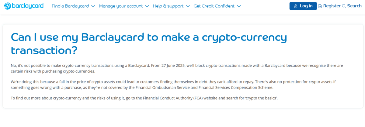 这一声明发布在巴克莱银行官方网站的客服页面,回应了用户关于能否使用巴克莱信用卡进行加密货币交易的咨询。银行明确回复:"无法使用巴克莱信用卡完成加密货币交易。"