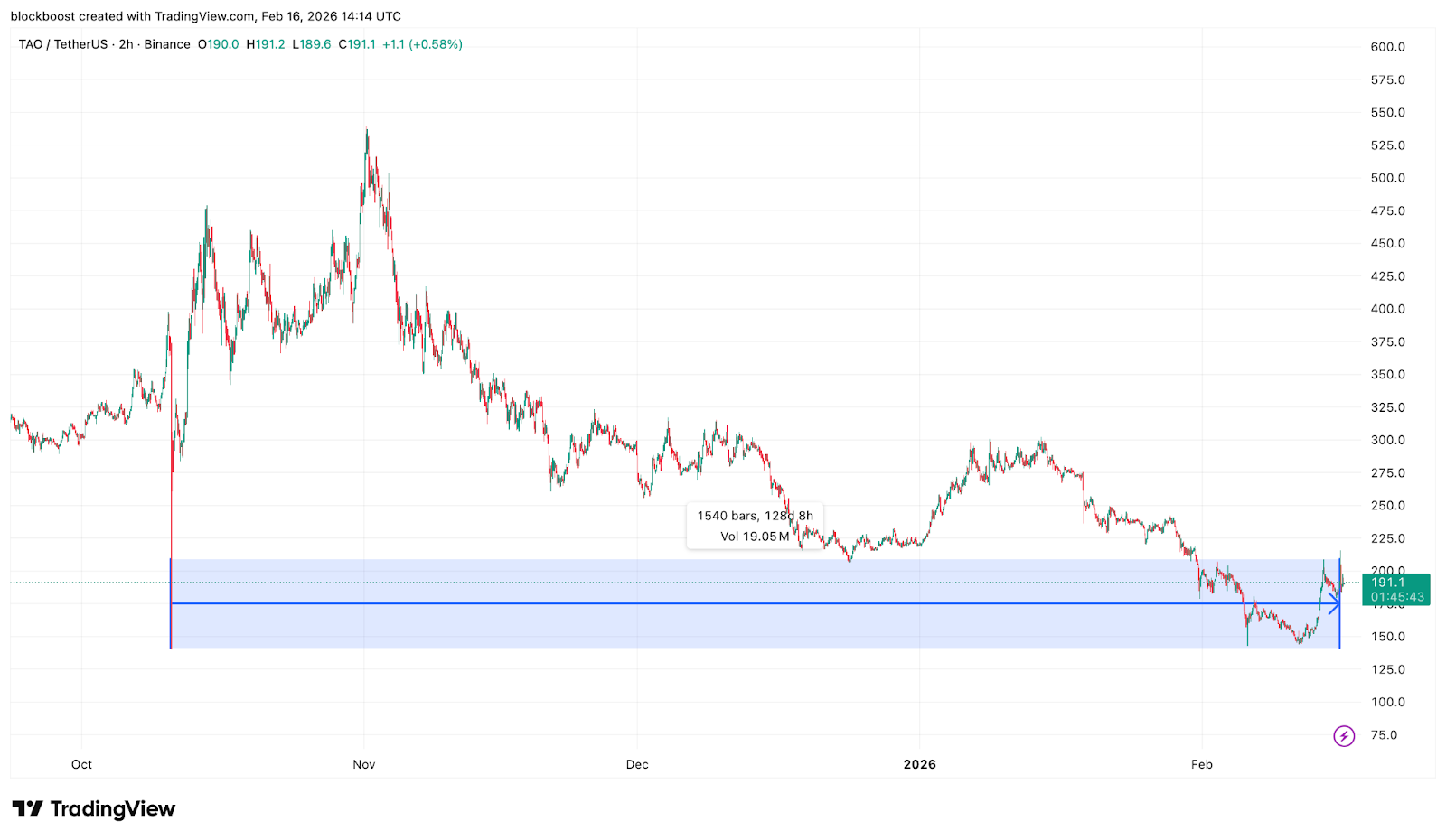 TAO从10月10日市场暴跌期间形成的140美元水平支撑位强势反弹。一笔30,000枚TAO的市场现货买单,加上Upbit的多交易对现货上线,共同推动了这轮复苏。