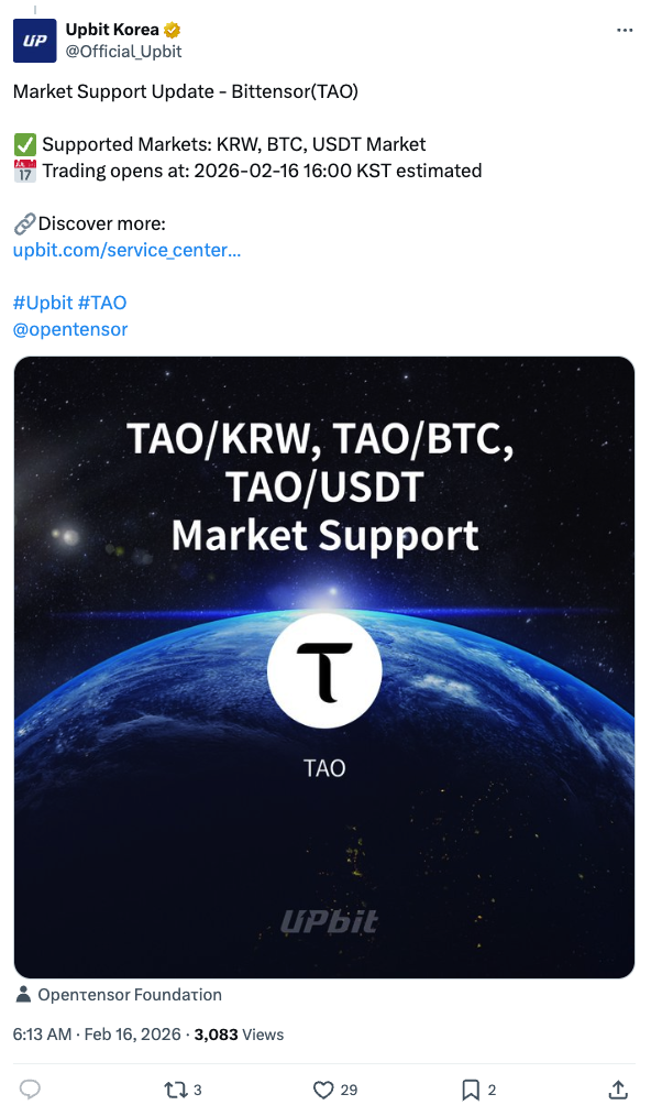 Upbit上线Bittensor (TAO):韩国最大的交易所Upbit于2月16日正式上线Bittensor (TAO),并增加了KRW、BTC和USDT交易对。该上线引发了流动性激增,推动TAO成为当日涨幅最大的代币。