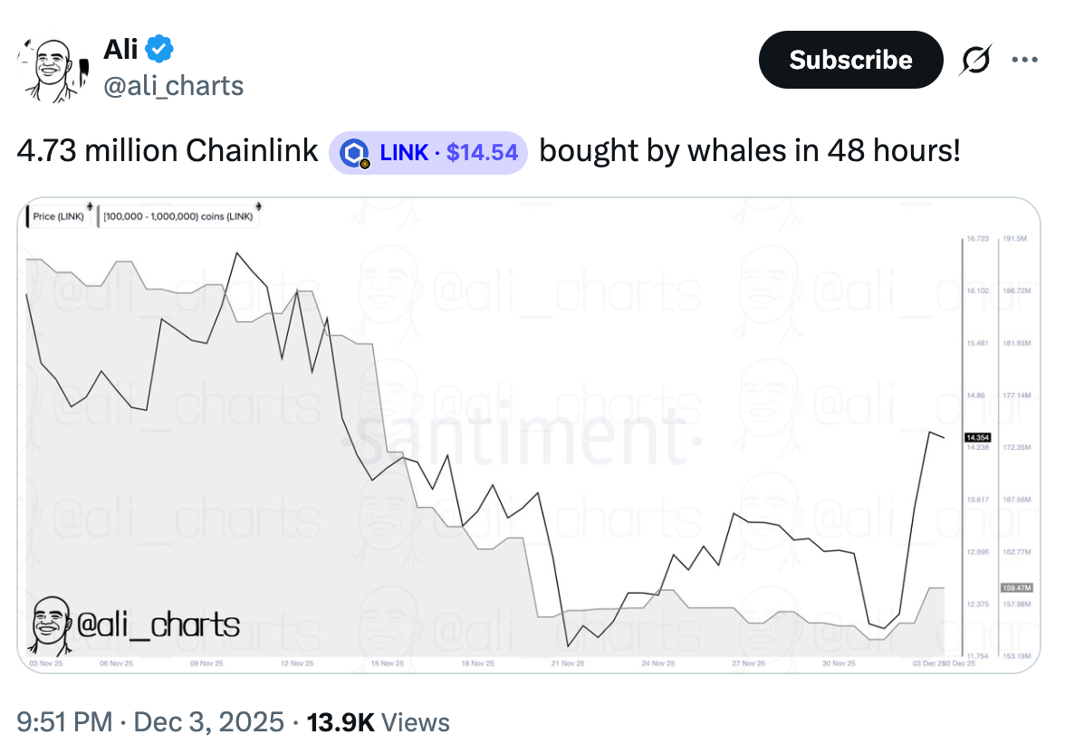 在11月下旬因清算压力短暂跌至12.30美元附近后,LINK已企稳并回升至14-15美元区间。这一反弹恰逢大额持有者的积极吸筹,其中包括中级鲸鱼钱包在短时间内增持了约470万枚LINK。从历史上看,这一积累区域往往标志着Chainlink升级前的重要转折点。
