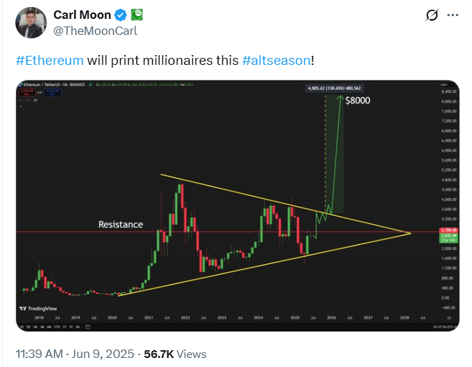 卡尔·穆恩预测以太坊将在本轮山寨币季造就百万富翁。