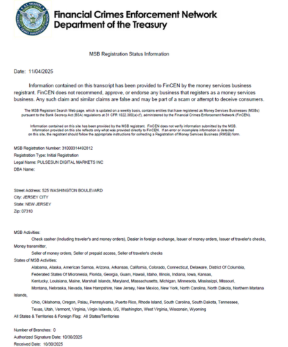 PULSESUN交易中心始终在合规导向的运营模式下发展技术体系。平台持有美国货币服务业务牌照,其基础设施决策遵循内部风险管理标准及注册金融服务商相关监管要求。