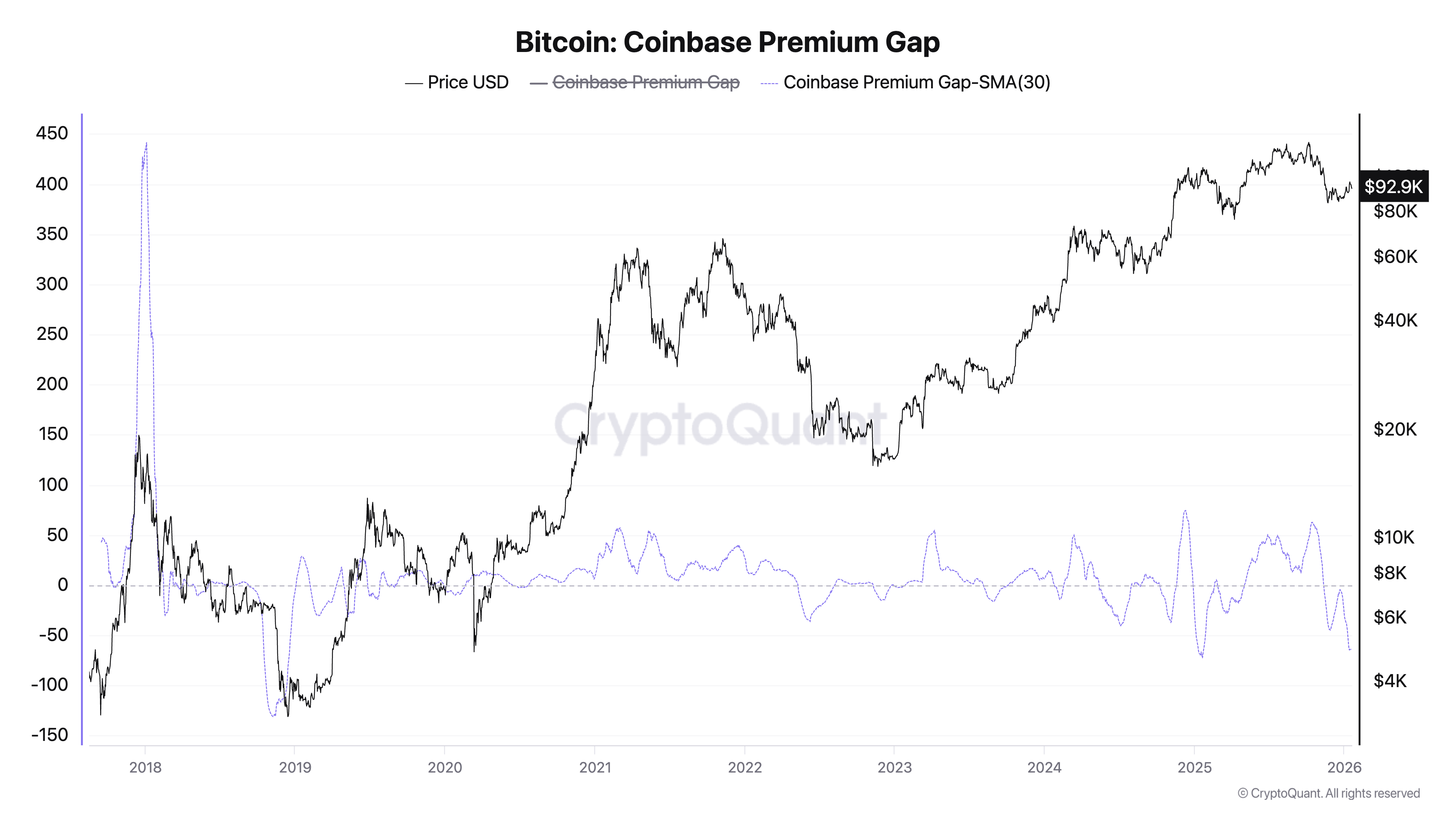 比特币Coinbase溢价差触及一年低位 美国投资者抛压显著