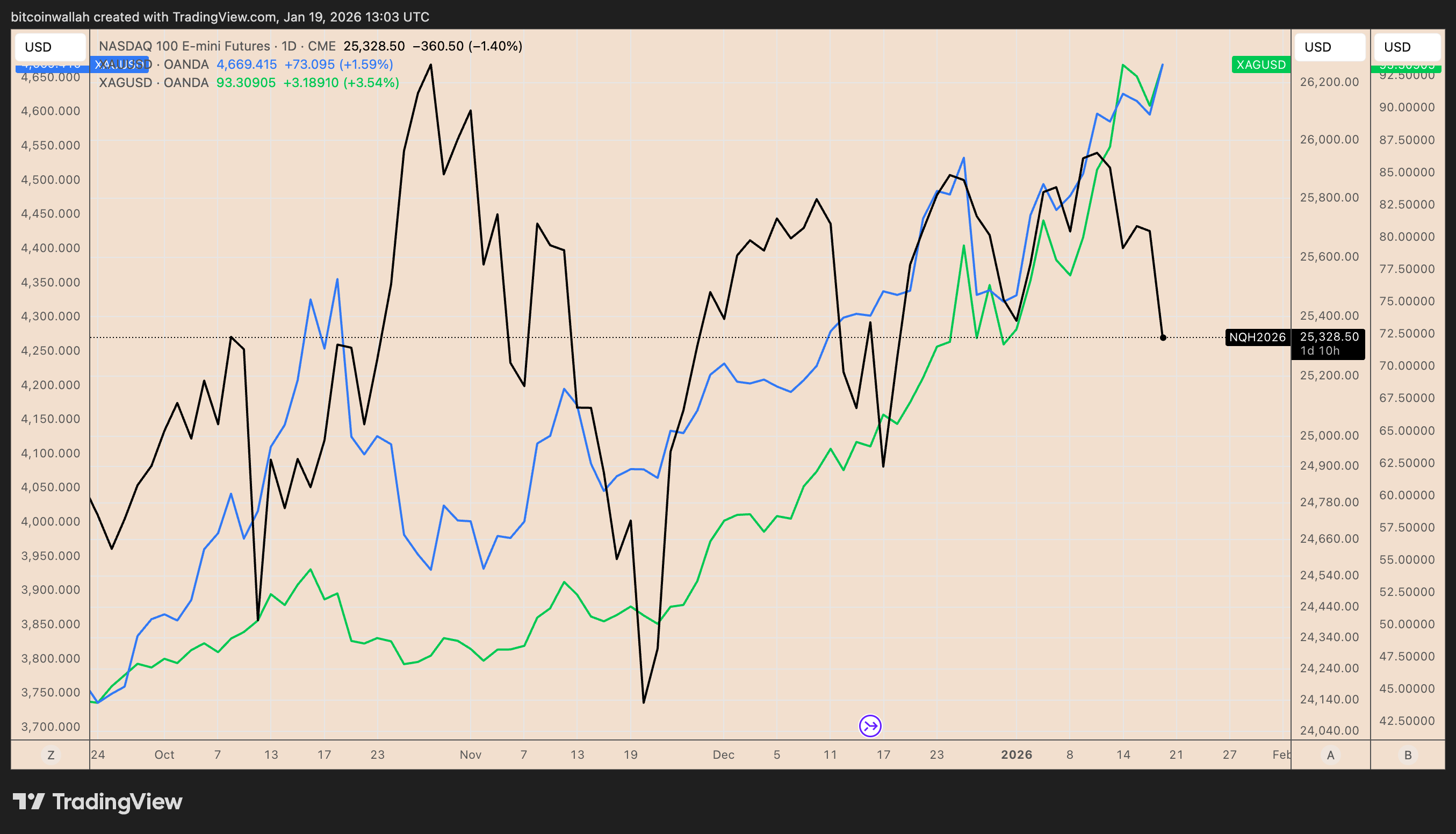 与此同时,黄金和白银等传统避险资产出现上涨,表明资本正从风险资产中轮动。