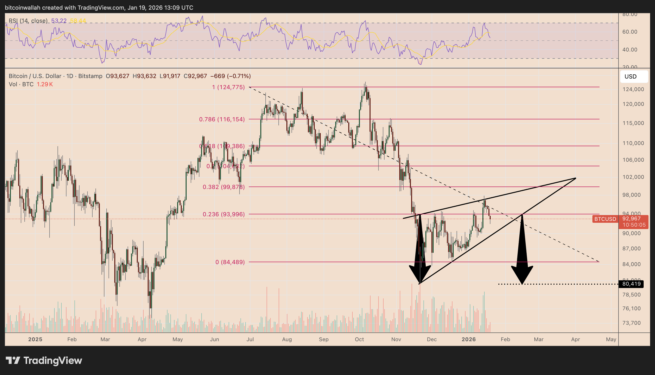 比特币日线图显示出上升楔形形态,这种形态通常在调整性反弹中预示着上行势头减弱。价格虽然创出更高的低点,但处于收窄的趋势线内,反映出买盘信念正在萎缩。如果宏观压力持续并将溢价差进一步推入负值区间,这种结构将增加向下破位的风险。