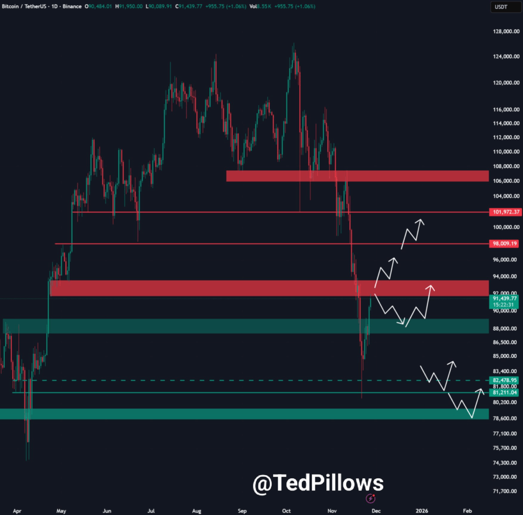 感恩节期间比特币价格飙升之际,市场专家对该资产未来轨迹提出了关键见解。分析师Ted在近期X平台发文中指出,突破89,000美元标志着BTC价格达成重要里程碑。该专家补充道,若比特币美元能突破94,000美元阻力位,则短期内有望收复100,000美元关口。反之,若未能守住支撑位,则可能下探88,000美元。