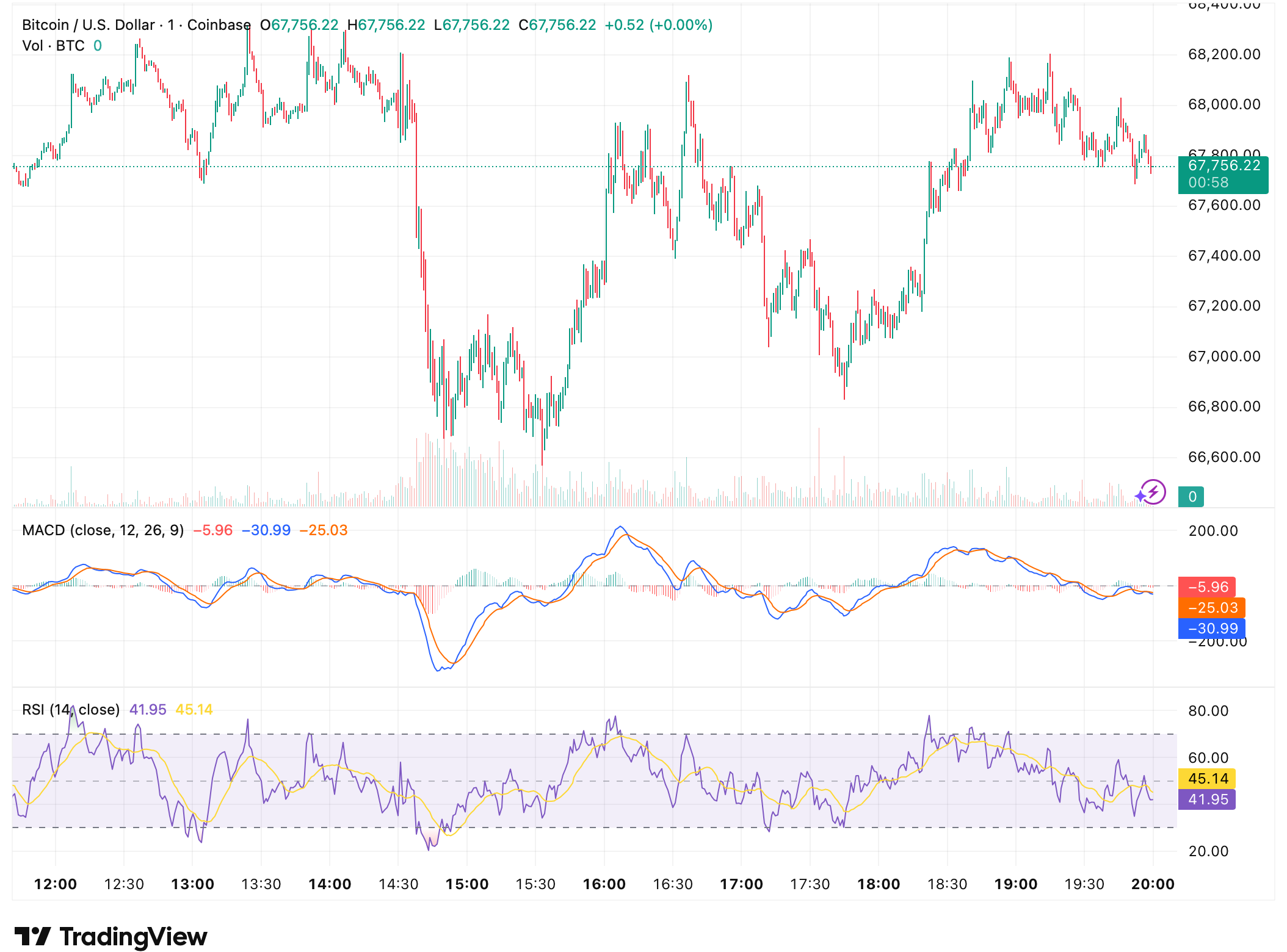 根据Coinbase数据,周二晚些时候比特币交易价格在67,756美元附近,徘徊于日内大约66,800美元至68,200美元区间的中位。此前价格在午后经历急跌后被迅速买回,表明回调中需求依然存在。