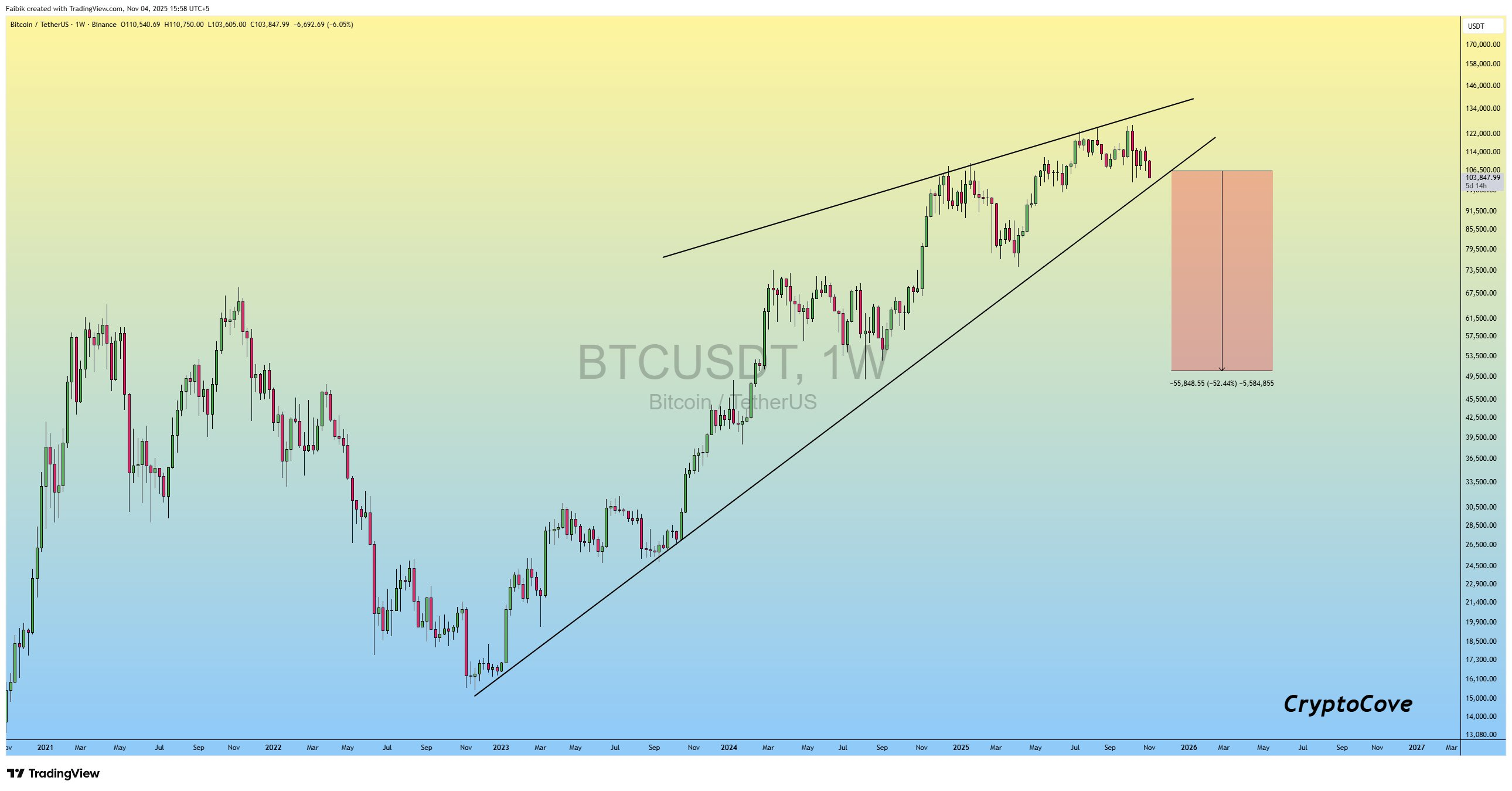 Faibik在最新分析中给出悲观预测:"比特币周线图即将完成上升楔形的向下突破",并表示对未来6-8个月的BTC价格持看空立场,预测可能进一步下探7.7万甚至5.5万美元。