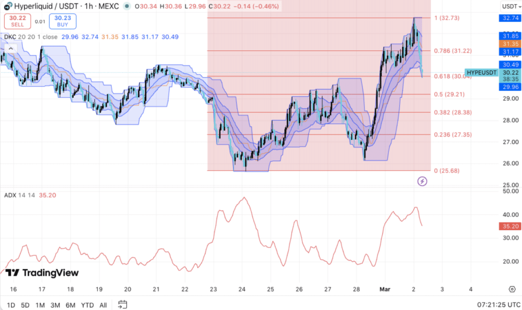 HYPE当前在30.67美元附近震荡,该位置对应近期上涨波段的0.618斐波那契回撤位。此区域现构成短期结构的直接支撑,只要买方坚守该水平,技术面上升趋势便依然有效。
