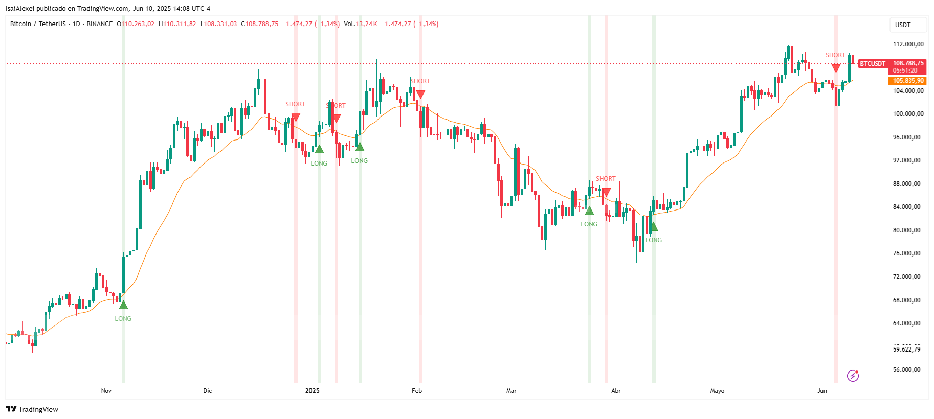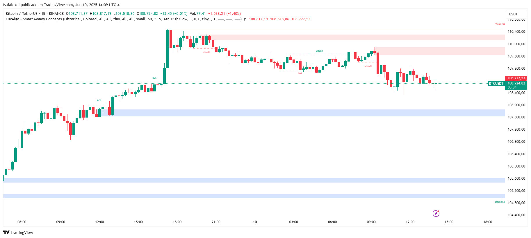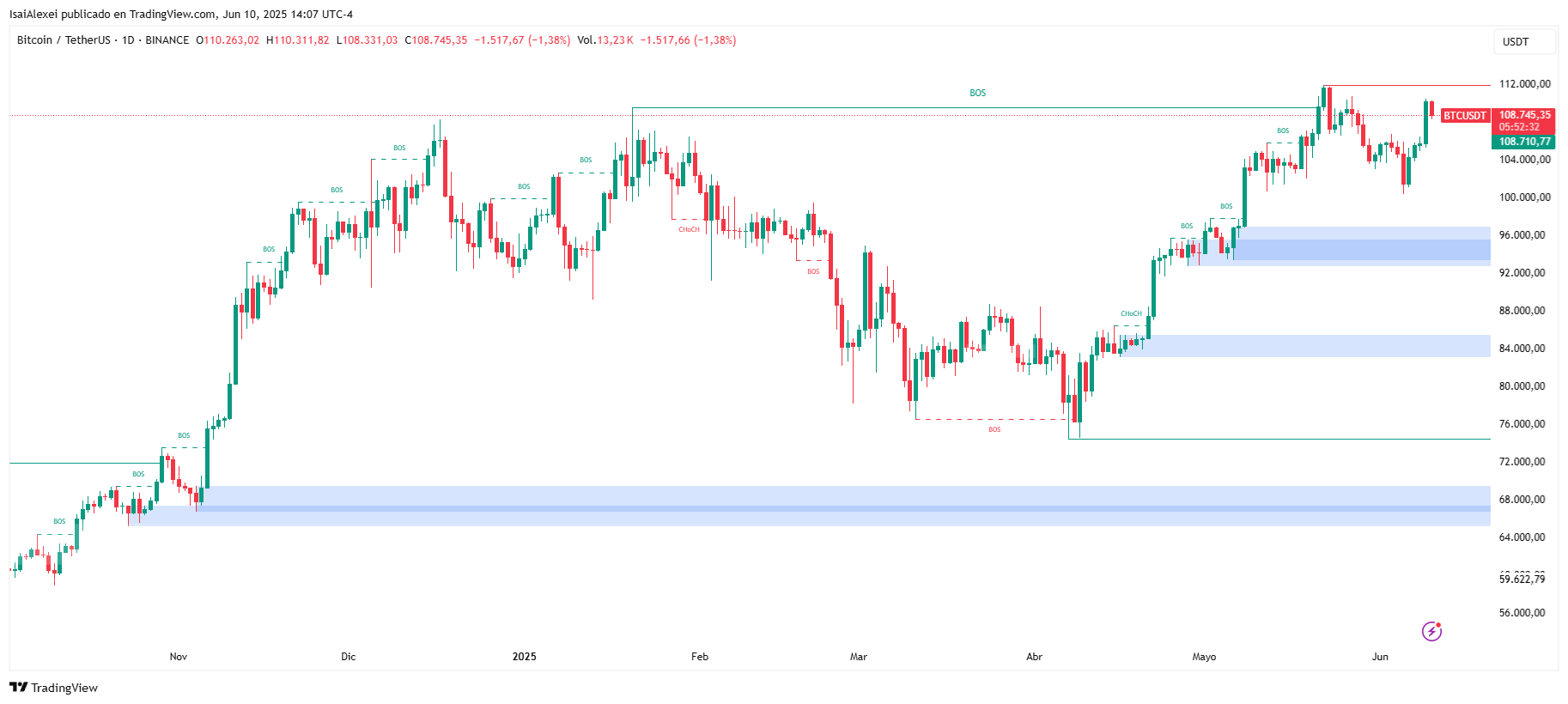 当前价格于历史高点112,000美元下方整固(2025年5月22日创下)。109K-112K区间成为关键决策带:有效突破将加速冲高,若遇阻可能回踩104K-105K支撑区。