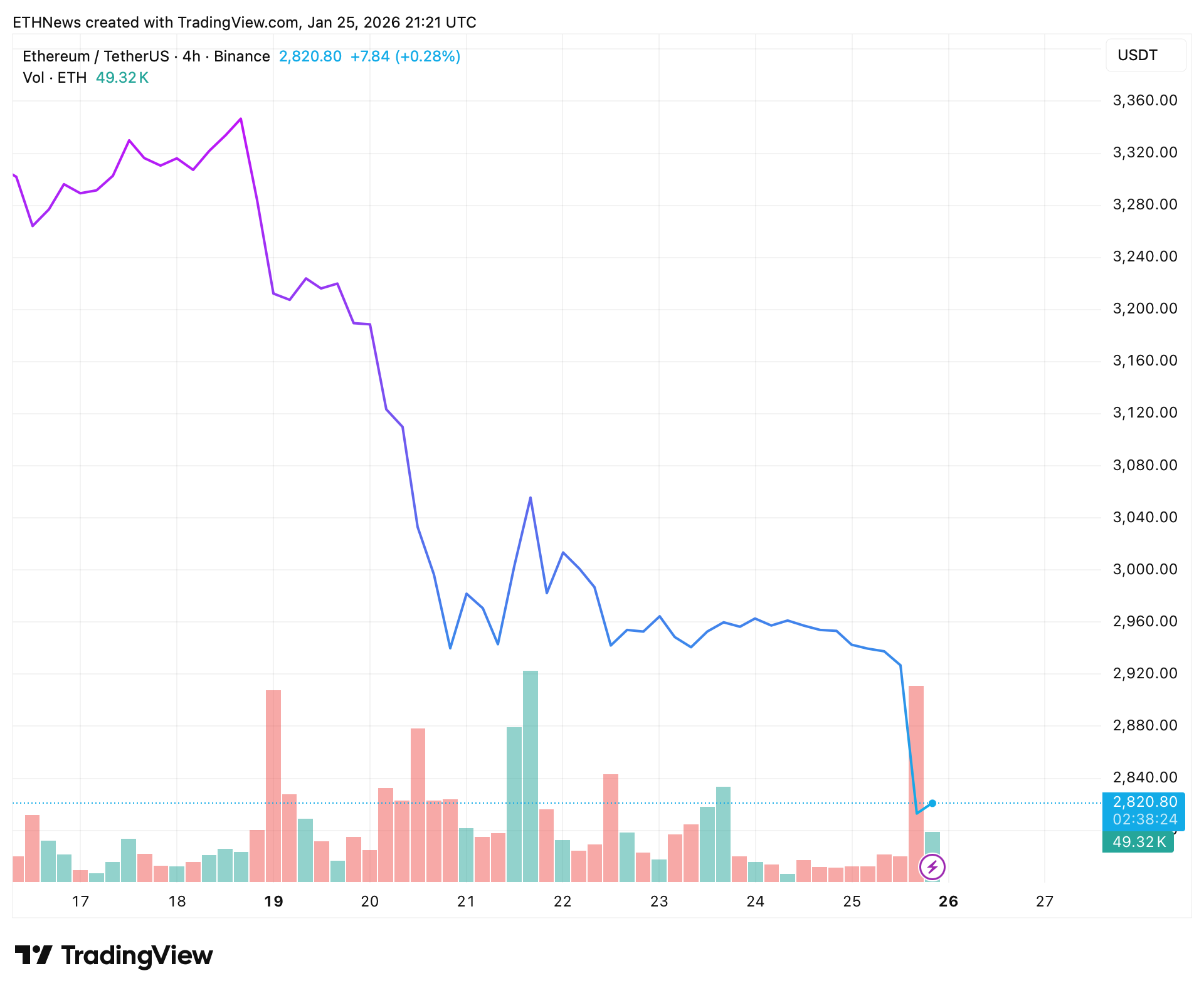 以太坊现交易于2818至2820美元区间,在经历连日急跌后尝试企稳,市场仍面临显著的技术性压力。虽然短期价格走势略有反弹,但更广泛的技术指标持续释放疲软信号,风险依然高企。