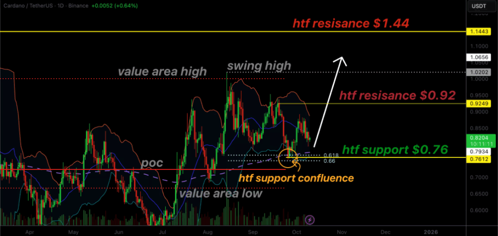 ADA仍保持着高低点上移的牛市特征,动量指标出现筑底信号:相对强弱指数(RSI)与异同移动平均线(MACD)正从超卖区域开始回升。值得注意的是,近期成交量保持稳定,表明空头压力正在减弱。