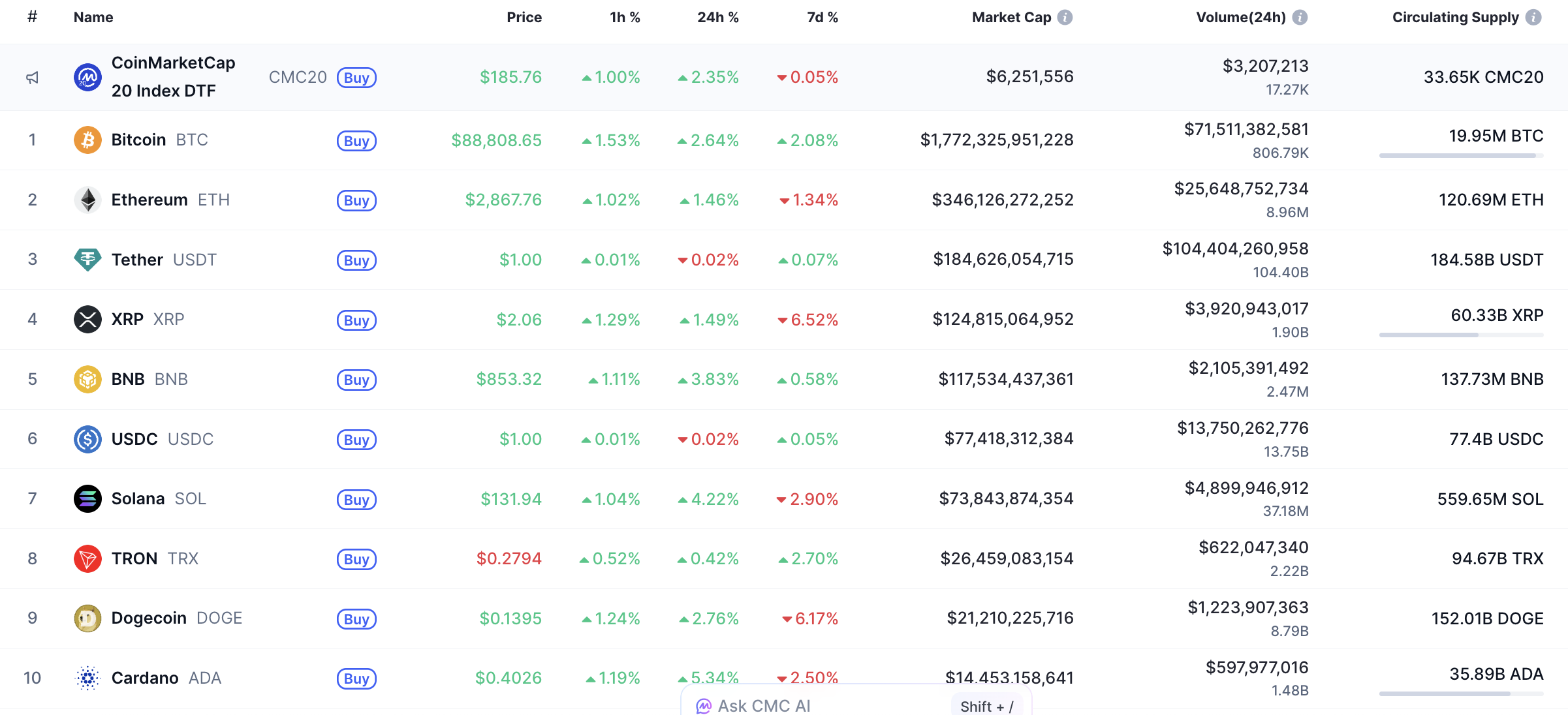 根据CoinMarketCap数据显示,加密货币市场整体重回上涨区间。