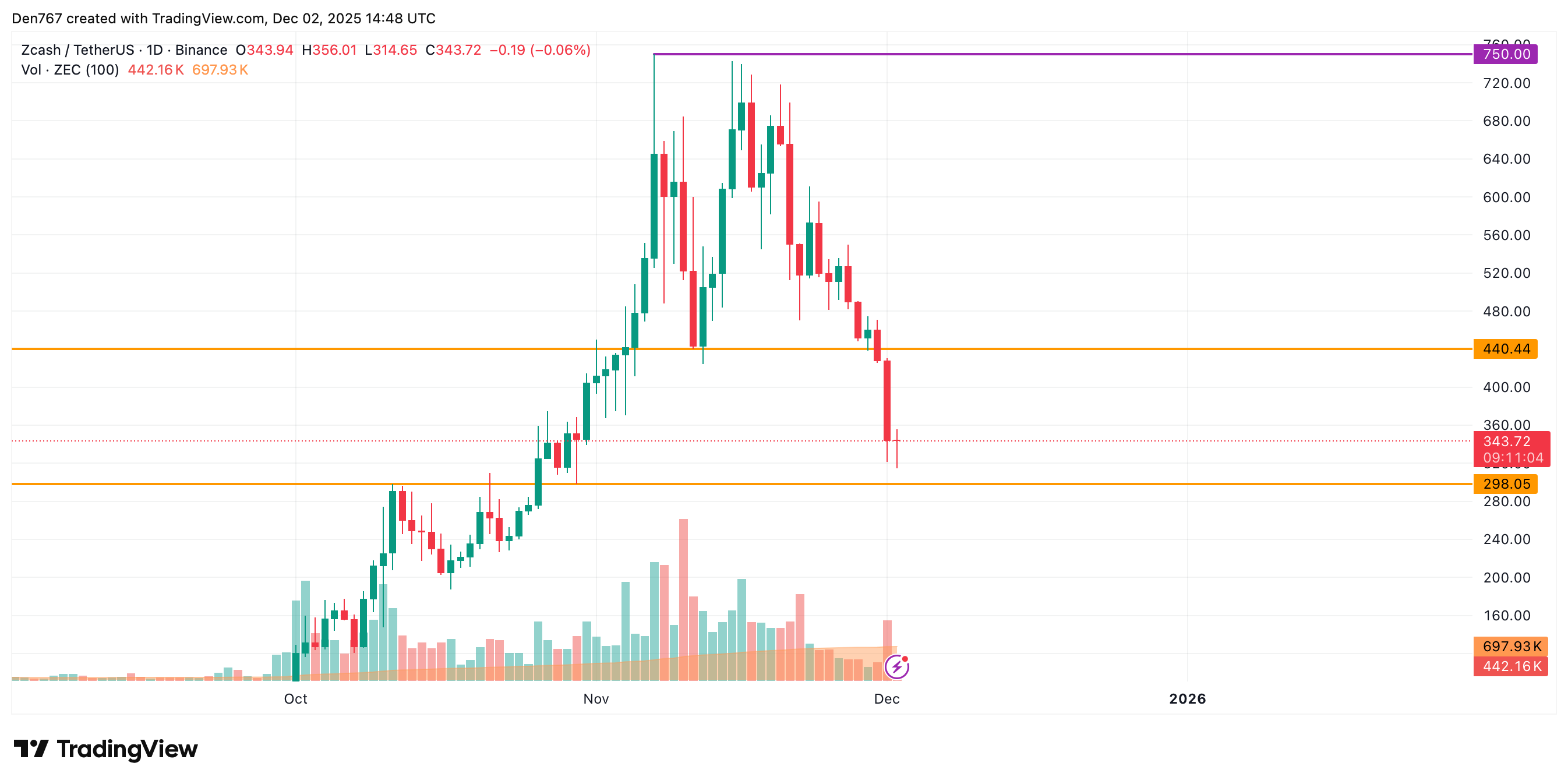 从更长时间框架观察,ZEC走势并不乐观,其价格未能有效远离298美元支撑位。但成交量出现放大,预示本周结束前可能出现较大波动。