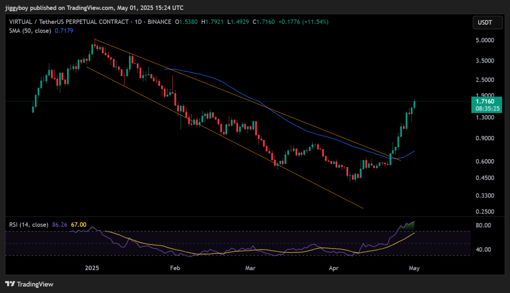 在日线图上,VIRTUAL价格突破了自1月以来一直限制其的下降通道。突破发生在4月中旬,随后出现了强劲的反弹。价格从0.50美元以下飙升至1.70美元以上。