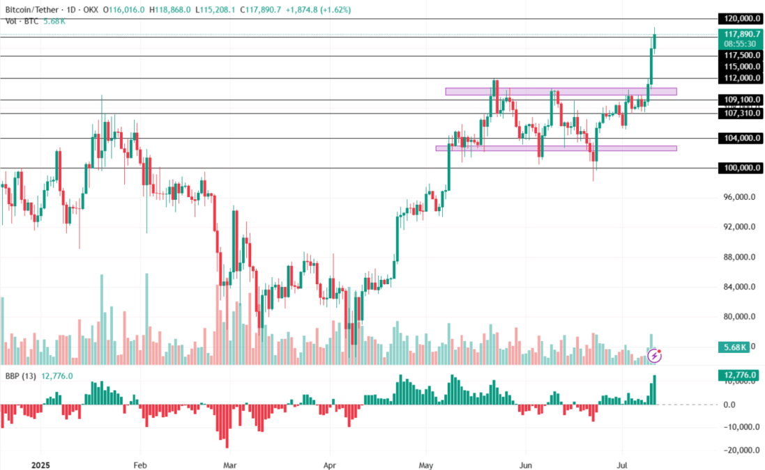 在机构投资者兴趣高涨和市场强劲势头的推动下,比特币价格持续攀升,突破118,000美元关口创下历史新高。这一里程碑事件引发加密领域投资者的多重疑问:比特币价格会突破12万美元大关,还是即将迎来回调?