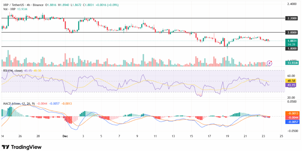 XRP价格在1.80至2.00美元区间内波动,表明4小时图正处于盘整阶段。卖家持续防守2.00美元阻力位,而买家在1.80美元支撑位上方维持压力。若能突破2.00美元,可能为通往2.20美元的下一个阻力位打开道路。然而,相对强弱指数位于43,显示买盘力量有限,MACD指标则反映出看跌交叉动能。