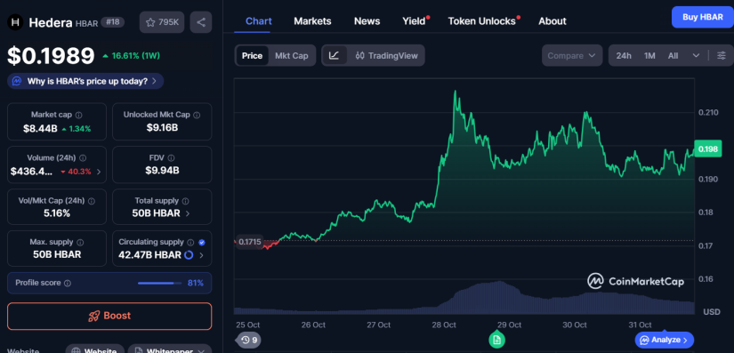 Hedera(HBAR)一周暴涨超16% 巨鲸减持引发涨势持续性疑虑