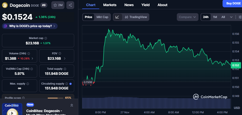 狗狗币交易于0.1524美元附近,小幅上涨反映了早盘上行与后续降温的走势。价格从日内低点上涨至0.156美元后回落收低。此外,这种形态显示出适度强度但缺乏持续动能。