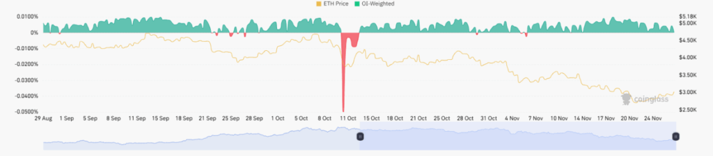 ETH持仓量加权资金费率图表显示了8月下旬至11月下旬不同的交易者行为。在此期间前期,资金费率保持在中性上方,显示中等程度的多头信心。在这些周期内,ETH交易价格曾高于4300美元,随后动能减弱。
