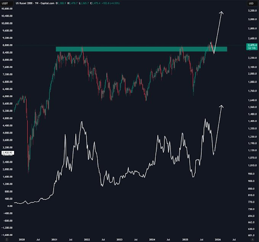 分析师指出,罗素2000指数通常为以太坊和山寨币提供早期信号。当该指数创下历史新高时,另类资产通常会跟随上涨。当前对阻力位的测试为加密货币交易者形成了关键参考。