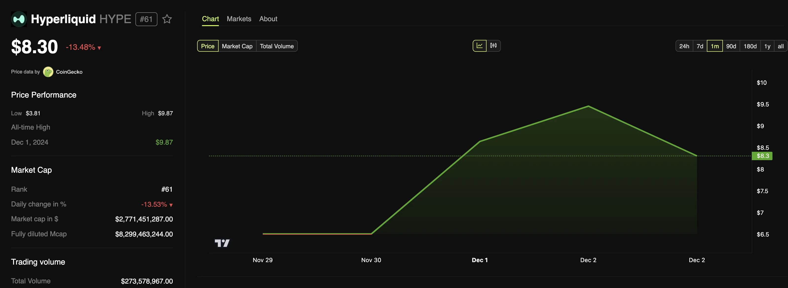 上周,Hyperliquid(HYPE)就已在热门山寨币榜单上,表明市场对该加密货币非常感兴趣。虽然今日仍在趋势中,但数据显示HYPE的价格已出现上涨。截至发稿时,HYPE的价格为8.52美元,过去24小时内下跌了11.82%。然而,该山寨币尚未在任何主要交易所上市,表明其可能仍处于价格发现阶段。如果交易所将其上市,HYPE的交易量可能会增加,进而可能推高其价格。