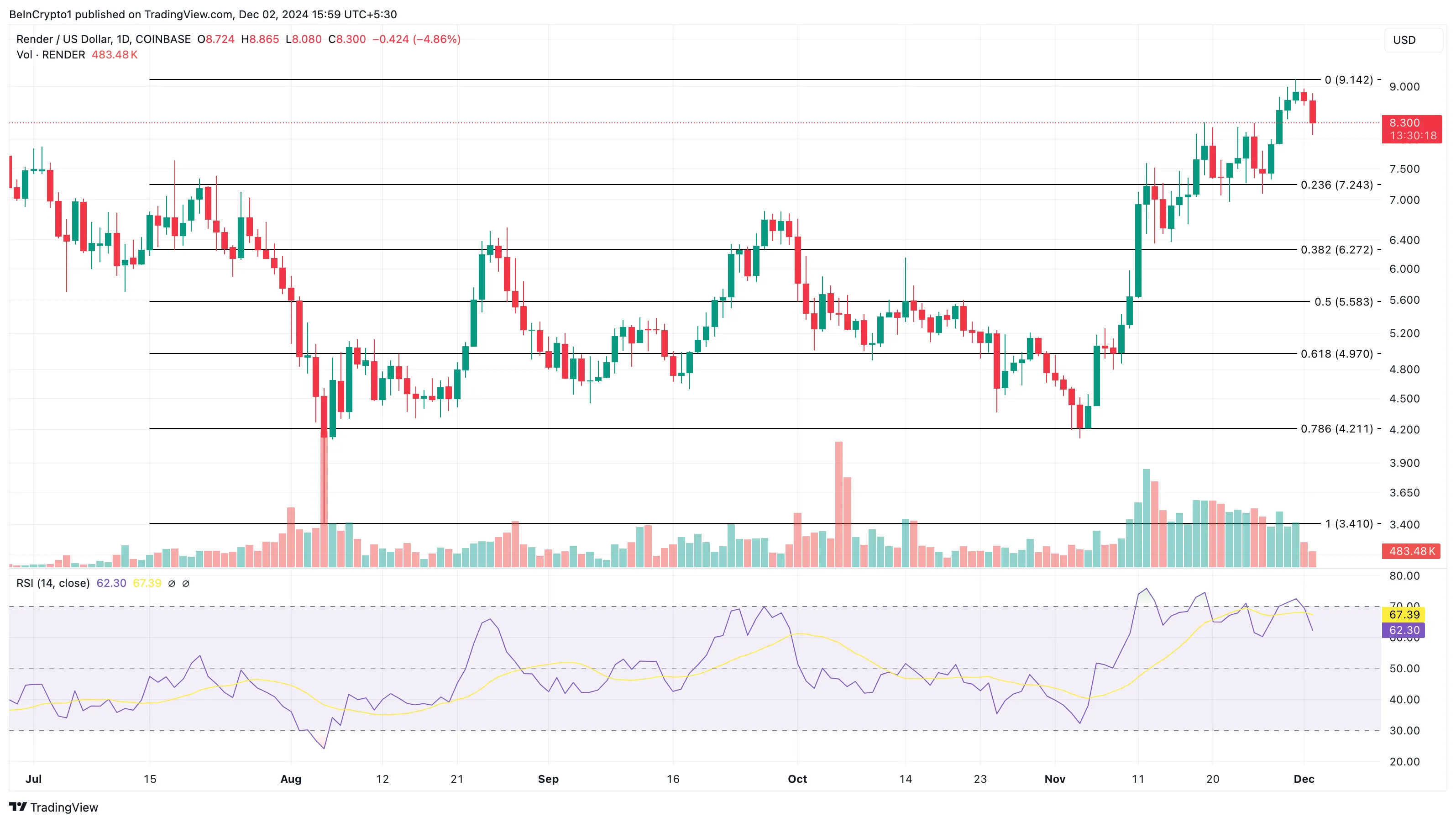 由于围绕AI主题加密货币的热议,Render成为今日最热门的山寨币之一。在过去30天内,其价格上涨了77.59%,但在过去24小时内下跌了5.70%。这种下跌可能归因于轻微的获利回吐,当前价格为8.30美元。从技术角度来看,相对强弱指数(RSI)下降,表明上涨势头已不再强劲。如果这种趋势持续,RENDER的价格可能会下跌至7.24美元。然而,如果买盘压力再次增加,价格可能会反弹至9.14美元。