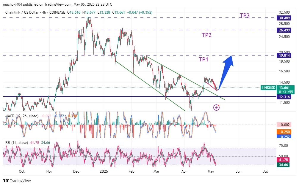 Chainlink(LINK)价格在2025年4月录得令人印象深刻的看涨突破后,一直在与短期看跌情绪作斗争。截至5月6日(周二)北美交易时段晚些时候,这个中等市值的替代币(完全稀释估值约为134亿美元,24小时平均交易量约为2.61亿美元)在过去七天内下跌了约9%,交易价格为13.43美元。