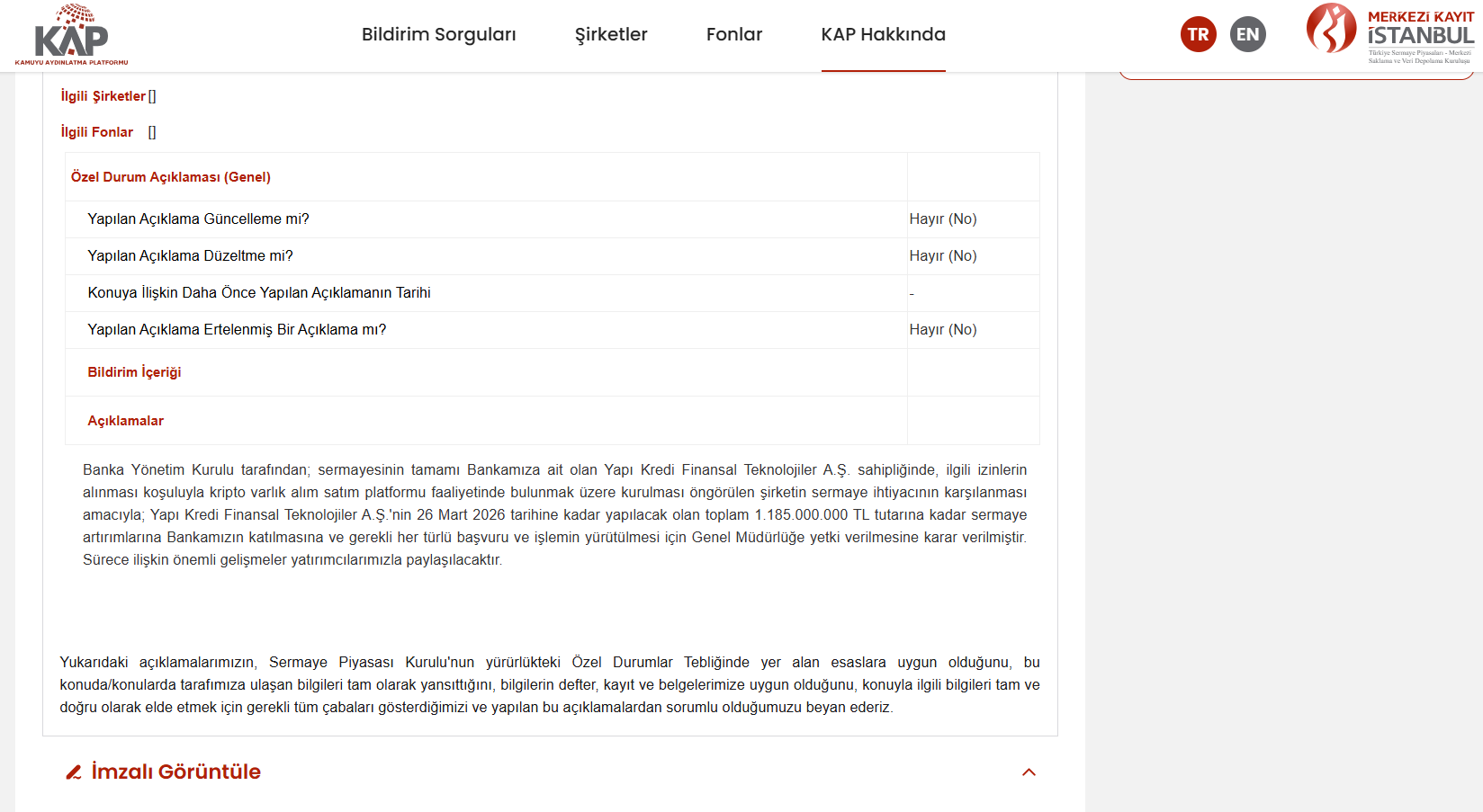 "银行董事会已决定在我们银行全资拥有的Yapı Kredi金融科技公司旗下设立一家从事加密货币交易活动的公司。计划到2026年3月26日前解决该公司可能高达11.85亿里拉的资本需求。已授权总行进行必要的申请和程序。有关该过程的重要进展将与我们的投资者共享。"