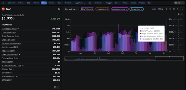 数据显示TRON在DEX交易量和永续合约量上呈现逆势增长。