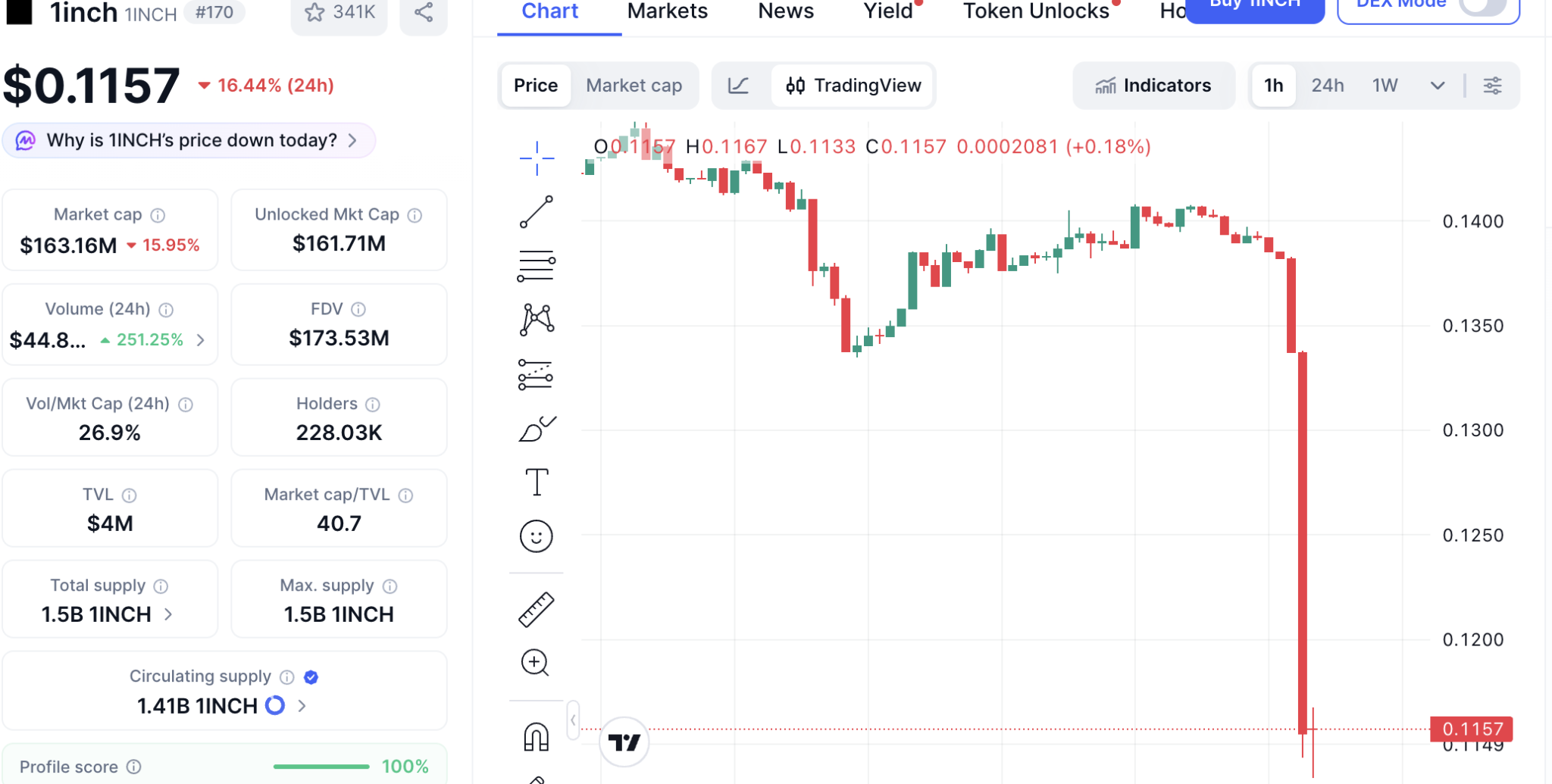 EmberCN同时指出1INCH交易量低迷的具体表现:币安上1INCH/USDT交易对24小时交易量仅为150万美元,其中116万美元来自套利机器人,实际流动性仅约34万美元。